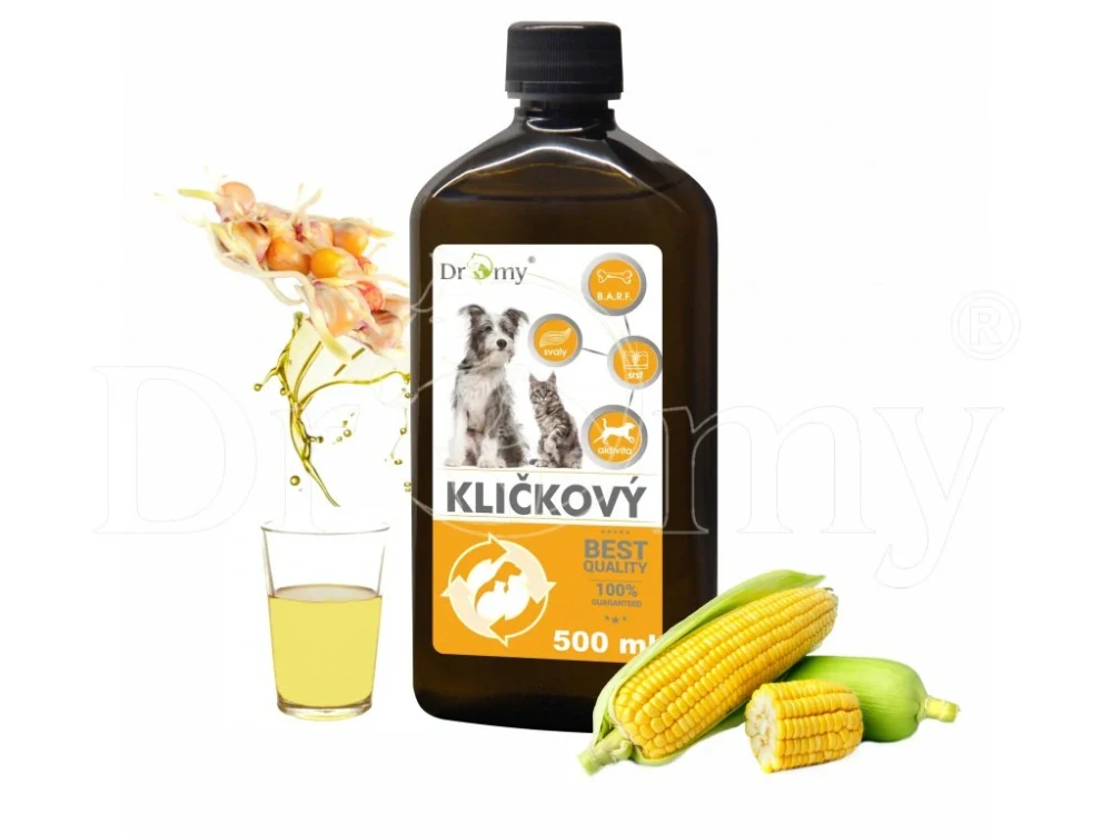 Jedno-druhový olej lisovaný za studena zo semien klíčkov kukurice, je pre psy a mačky zdrojom esenciálnych mastných kyselín. V klíčiacich semenách dochádza k vysokému nárastu živín aj zásaditosti. organizmu chráni bunky pred oxidačným stresom a účinkami voľných radikálov. Podporuje novotvorbu buniek, funkciu kožnej bariéry a chráni pokožku pred dehydratáciou.