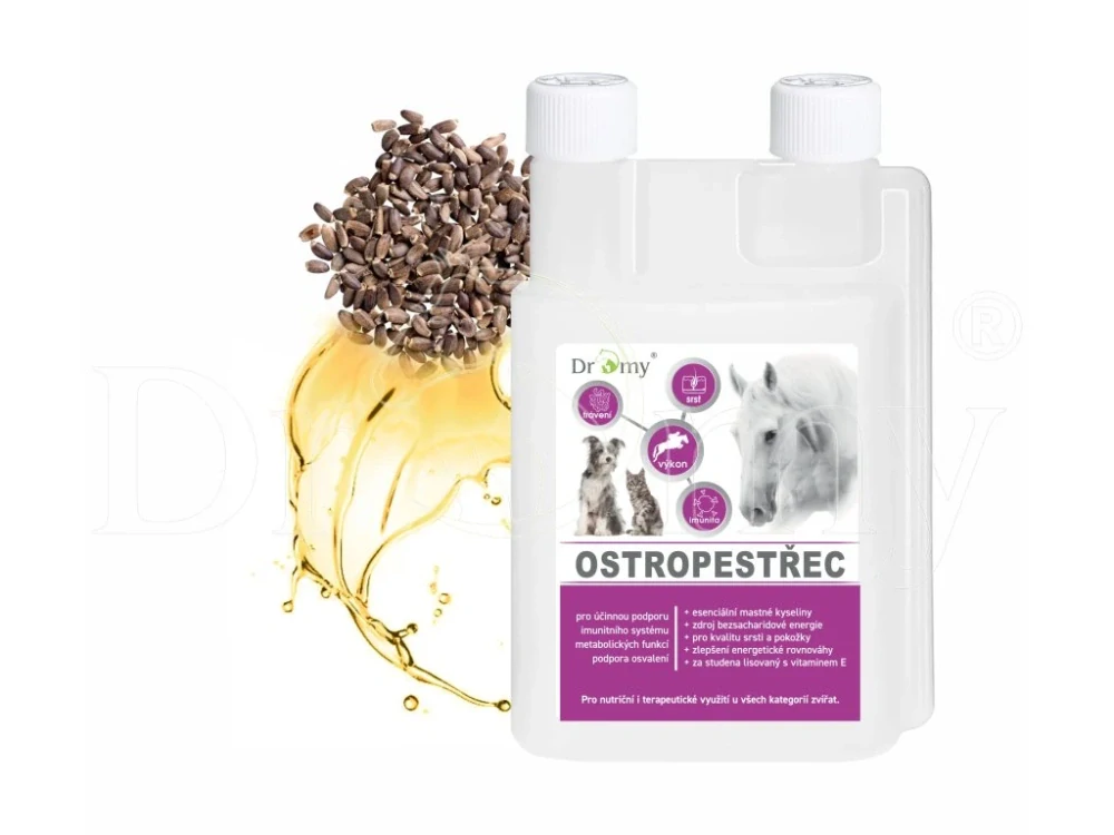 Dromy® Pestrecový olej za studena lisovaný pre všetky kategórie koní, psov a mačiek, určený na obohatenie kŕmnej dávky o esenciálne mastné kyseliny, vitamíny, bez konzervantov a farbív, vysokej kvality.