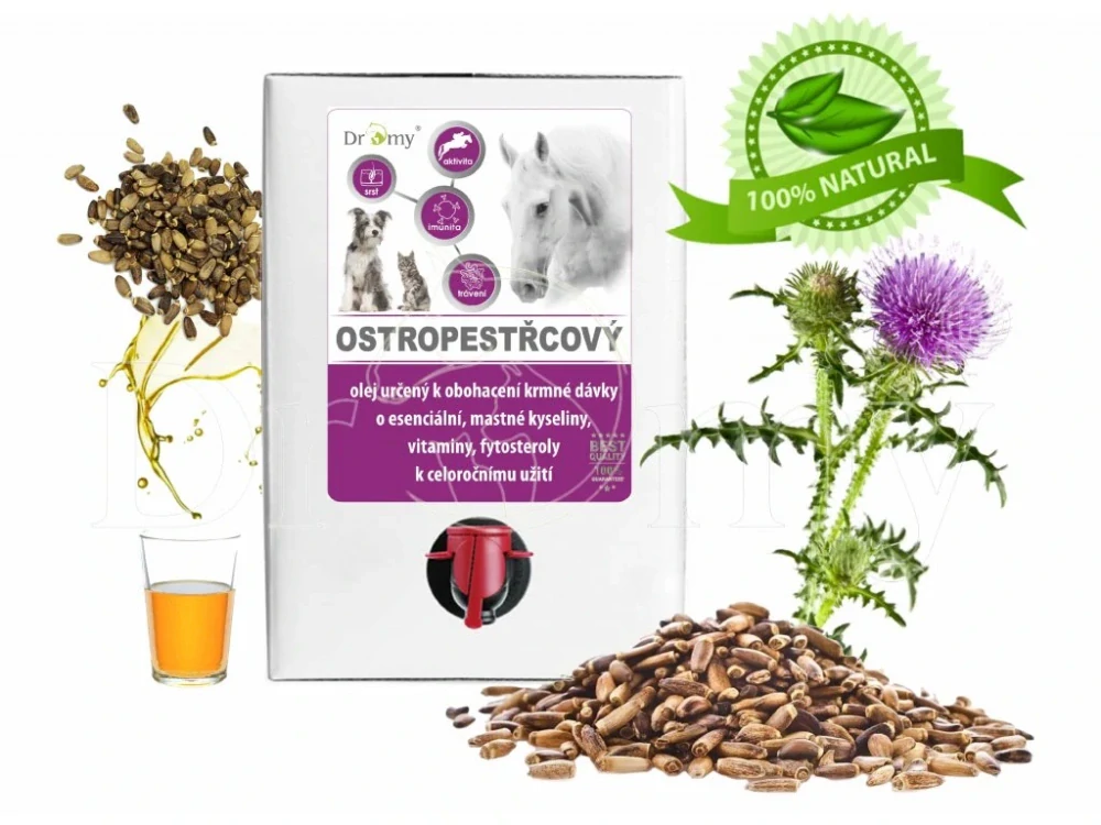 Dromy® Pestrecový olej za studena lisovaný pre všetky kategórie koní, psov a mačiek, určený na obohatenie kŕmnej dávky o esenciálne mastné kyseliny, vitamíny, bez konzervantov a farbív, vysokej kvality.